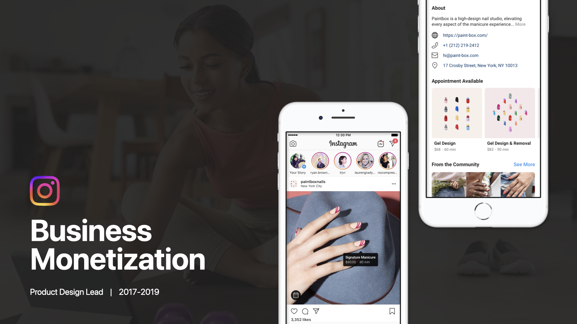 I led a design initiative for Instagram Core Business & Monetization. My main focus was unlocking organic monetization opportunities for SMBs through native transactions, integrated payments, and appointment booking services. I also drove business growth by establishing new business conversion flow, and created tools for Business Messaging and Insights.