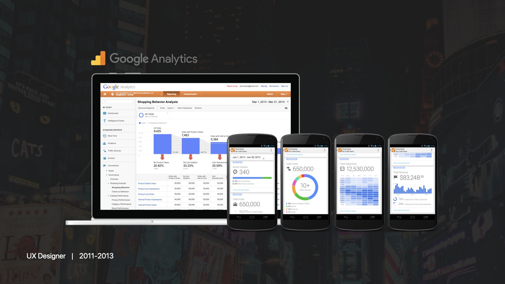 I started my career at Google Analytics, where I launched design solutions for E-commerce Analysis, Audience Reporting, Multi-Channel Funnels, Conversion Tracking & Attribution Modeling Tools. I also led a design initiative for Google Analytics’ first native app on mobile.